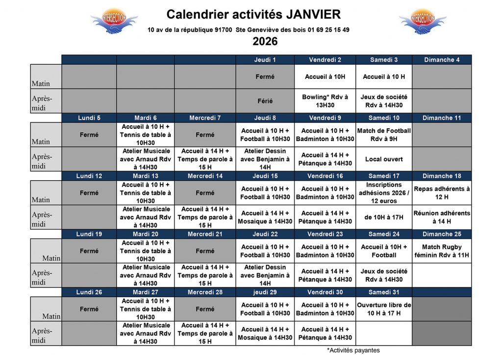 Planning du mois de Janvier